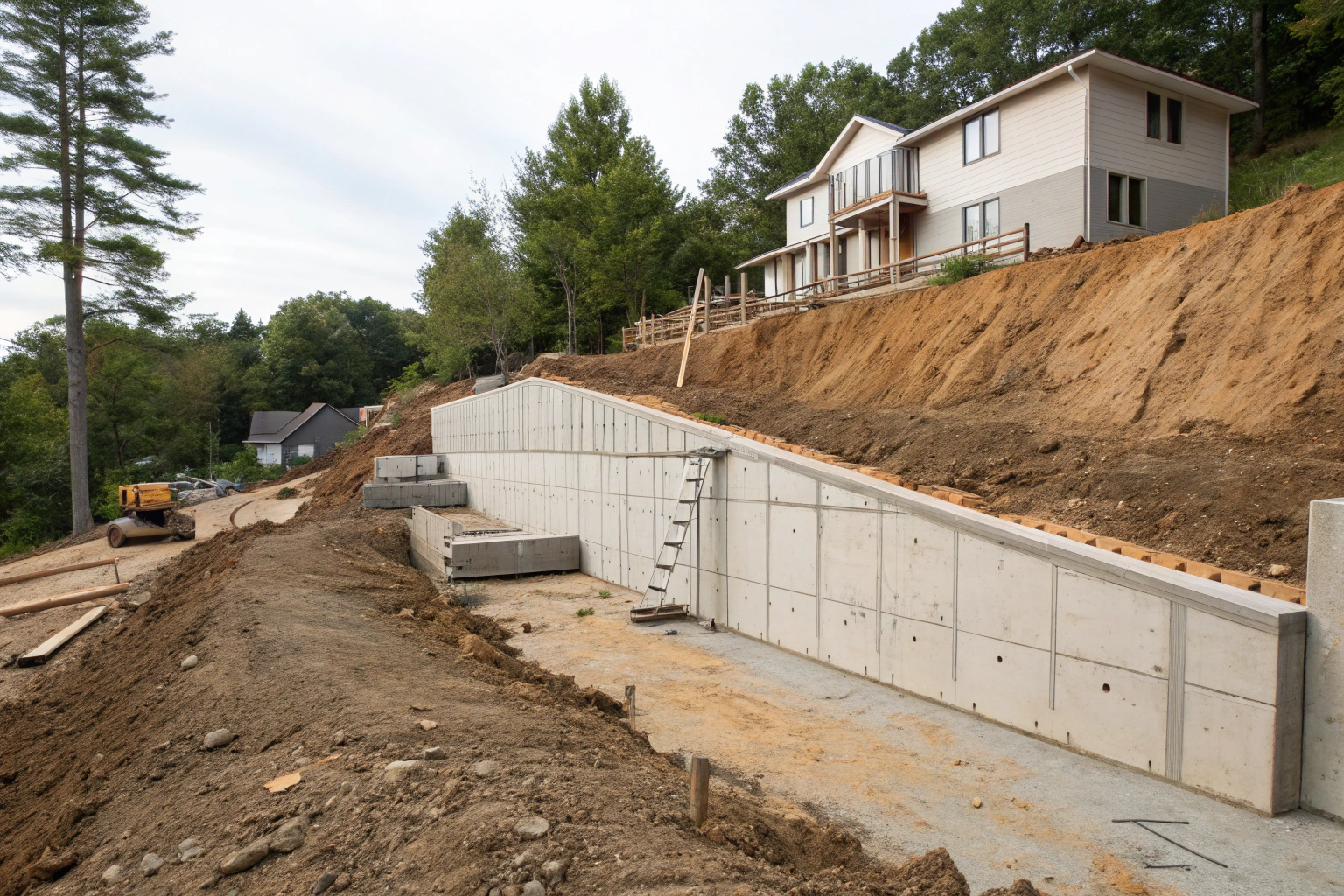 - Building platform support — retaining cut-and-fill faces on new home construction sites to create level building pads across sloped lots